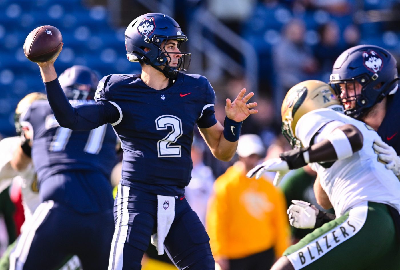 “I think that this quarterback (Mensah) is outstanding in the pocket, finding passing lanes, moving around in the pocket and still keeping his eyes down the field,” UConn coach Jim Mora said. “And then they’ve got a good group of receivers, so they’re playing with a high level of confidence right now. When a quarterback can find a rhythm because his offensive line and his backs, and his tight ends who are also involved in pass protection, are doing a good job for him, then that just builds confidence.”