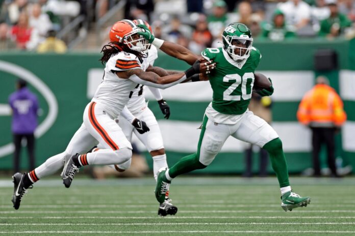 Breece Hall’s 125 all-purpose yards and six defensive sacks helped the Jets (2-7) defeat the Browns (2-7) 27-20 on a rainy afternoon at MetLife Stadium.