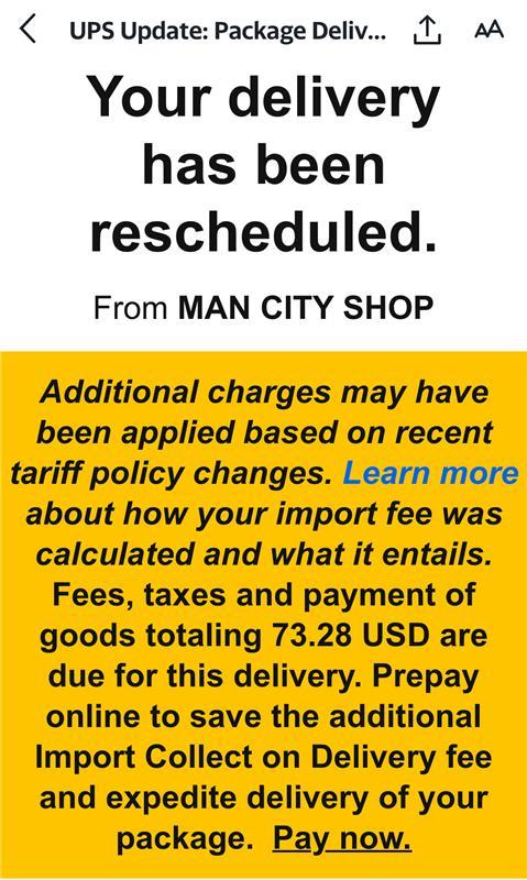 UPS later sent an email notification of “fees, taxes and payment of goods” worth an additional $73.28 still due for the order. The commercial shipper also sent a driver to deliver the notice in person and explain that the delivery would not be completed until the balance was settled.