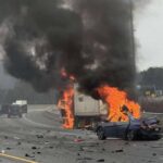 Witnesses described a scene of pure desperation. One driver recalled seeing the Hyundai clip a tan GMC Canyon before the impact that changed everything. The small car slammed into a JB Hunt tractor-trailer with such force that it ricocheted off the truck and into a concrete barrier. Within seconds, both the car and the massive semi-truck were engulfed in thick, black smoke and orange flames.