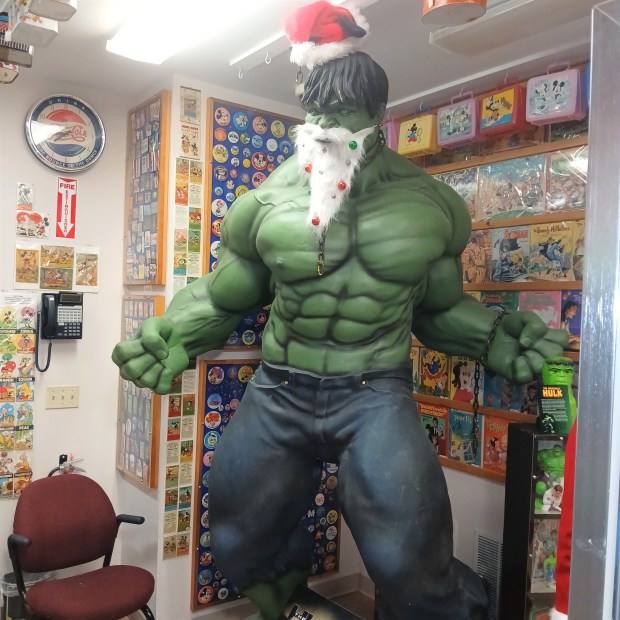 There are board games, some still in their cellophane wrapping, based on television shows like “Man from U.N.C.L.E.” and Barbie. Lunchboxes of every description hang neatly from the rafters of the first-floor display room, and movie props, like a full size Hulk with a lighted Christmas beard, stand in a corner.