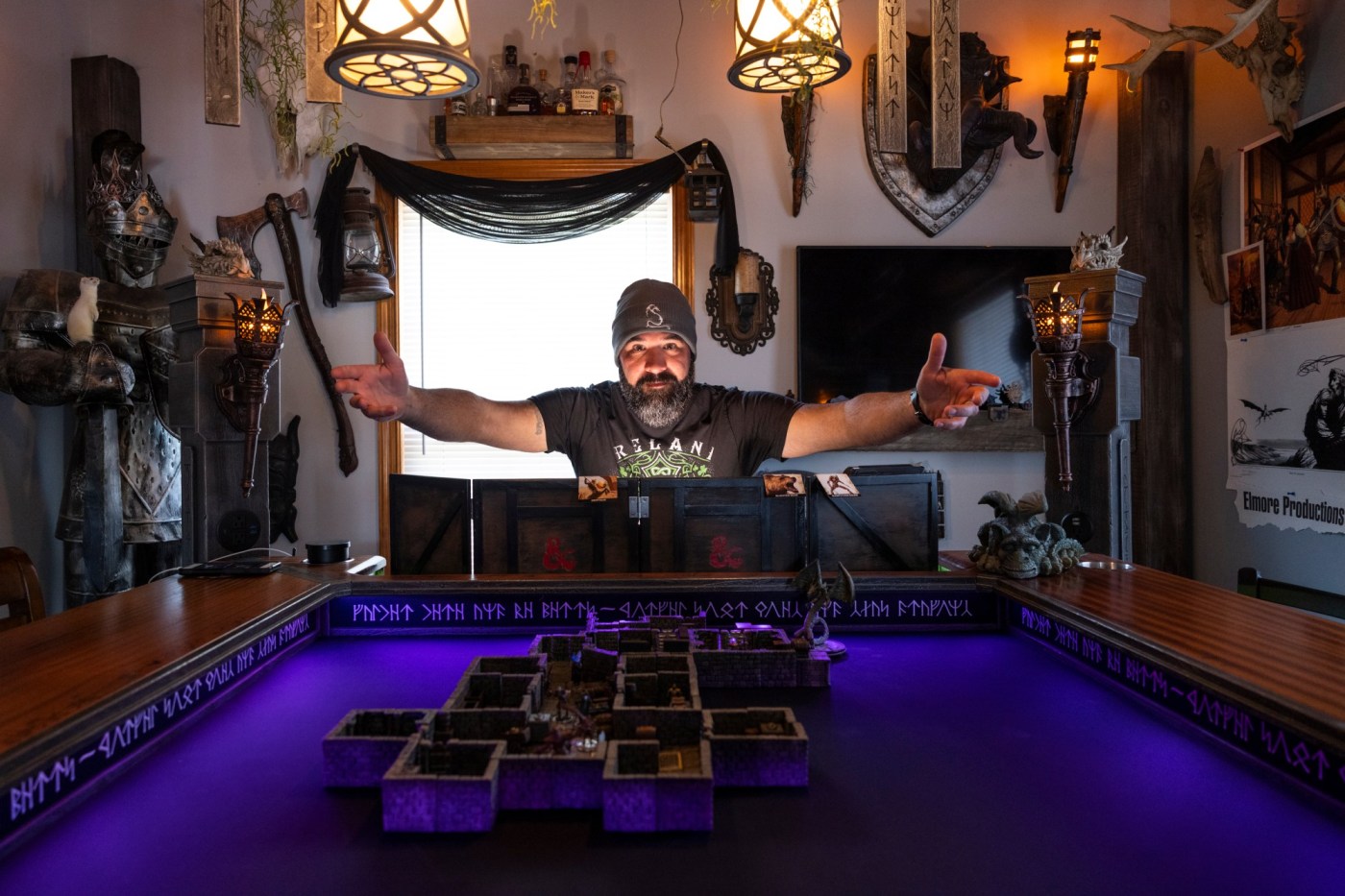 The heads of a “mind flayer” and an “owl bear” — creatures of Dungeons & Dragons lore — decorate Michael Jimenez’s game room, furnished with fantastical figurines and assorted medieval weaponry. A flail dangles. Swords shine all around.