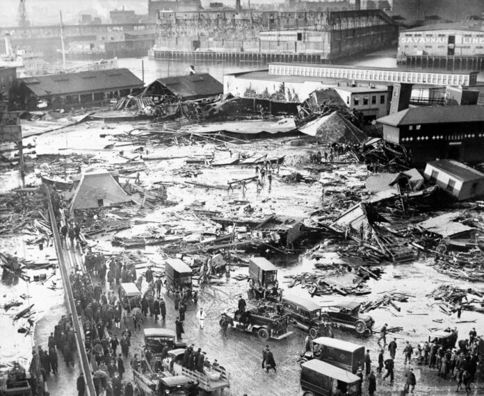 On Jan. 15, 1919, in Boston, a tank containing an estimated 2.3 million gallons (8.7 million liters) of molasses burst, flooding the city’s North End and killing 21 people in what was later dubbed the “Great Molasses Flood.”