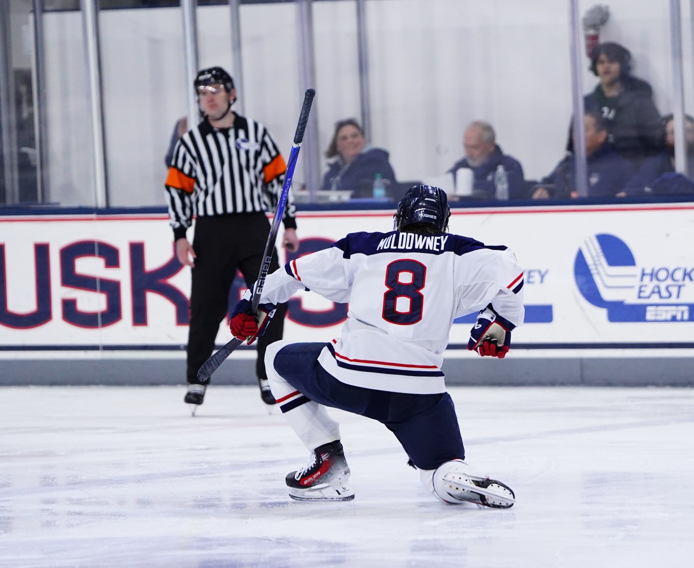 Trailing 2-1 heading into the final period, the 13th-ranked Huskies tied the game on a goal by Carlin Dezainde at 4:38. As the period continued and overtime was looking like a real possibility, the Huskies put the game away late with a pair goals within 41 seconds. Jake Percival scored first, beating Quinnipiac goalie Matej Marinov with what would be the winning score at 17:35. Teammate Joey Muldowney then added insurance at 18:16.
