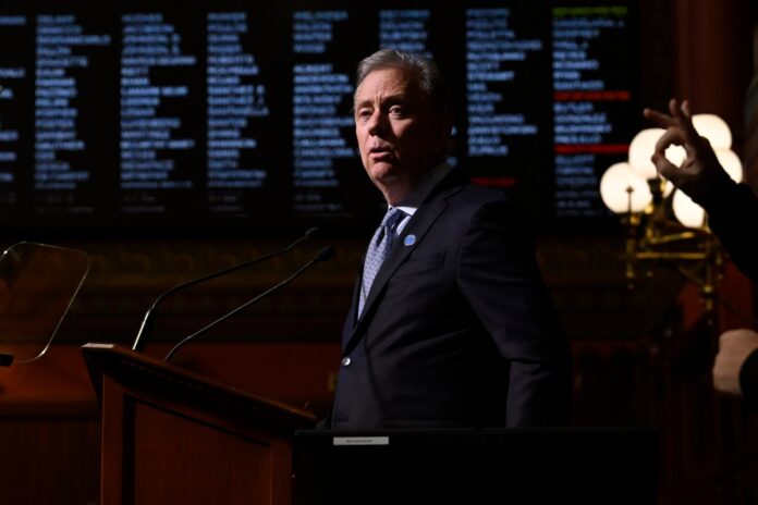 He touted the state’s steady finances and increasing stability, including a seventh balanced budget in a row, delivered on time, and a $4 billion rainy day fund, while the state has paid down over $10 billion in pension debt. He noted the recently increased minimum wage, an expanded income tax credit and the largest in history income tax cut, adopted in 2023.