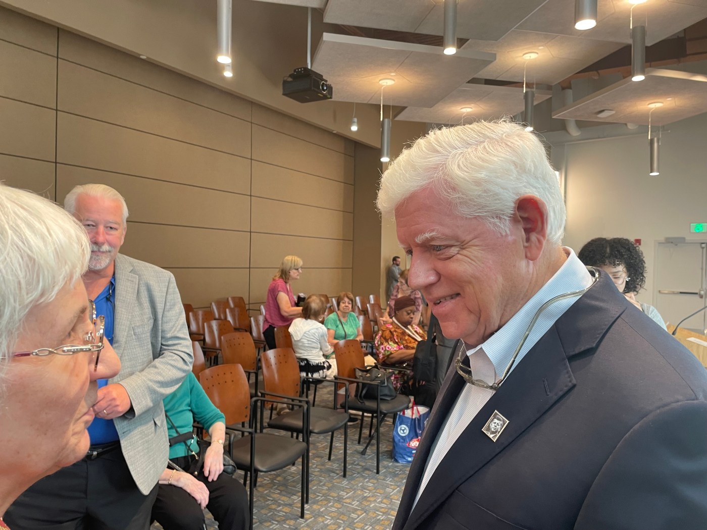 Former Hartford Mayor Luke Bronin is leading the pack in fundraising in a four-way primary for the First Congressional District. Here, he talks with Luis Melendez, left, and Naim Hassan at Parkville Market in Hartford before speaking to reporters about his announcement to challenge U.S. Rep. John Larson in a Democratic primary on July 30, 2025. (Aaron Flaum/Hartford Courant)