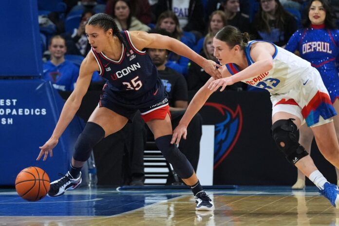 It was first of three steals for Fudd in the first quarter in addition to her 13 points, setting the tone for the Huskies in an 86-40 rout of DePaul in Chicago. The star guard went on to finish with a team-high 25 points, shooting 59% from the field and going 4-for-6 on 3-pointers.