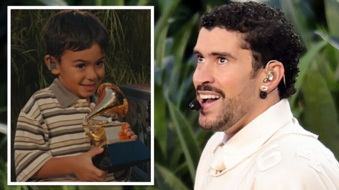 One of the numerous symbolism-laden vignettes that the Puerto Rican rapper danced through was that of a little boy watching his historic Grammy win on an old-fashioned television set with his parents in their living room. Then Bad Bunny swooped in, the award in his outstretched hands, and handed it to the child. The boy clutched it to his chest in overwhelmed delight.