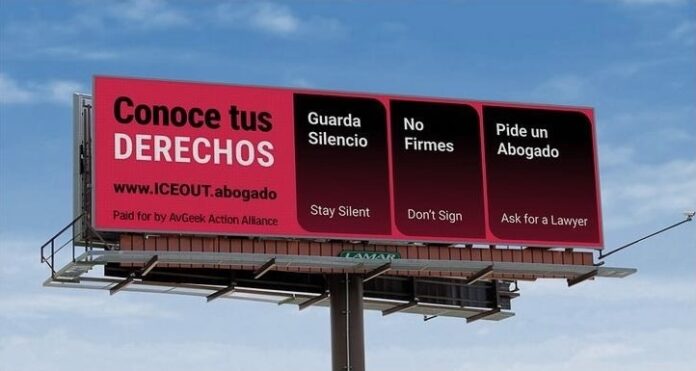 The billboard says in Spanish “Conoce Tus Derechos,” which translates to “Know Your Rights,” as well as “Stay Silent,” “Don’t Sign” and “Call a Lawyer” in both England and Spanish. The billboard also lists a website to download a “Know Your Rights” card and provides resources from the National Immigration Law Center.