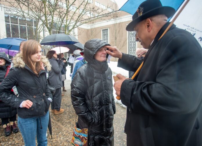 Interreligious leaders and people of faith from across Connecticut gather outside the federal immigration courthouse in Hartford for the Connecticut Interreligious Witness rally on Ash Wednesday.
