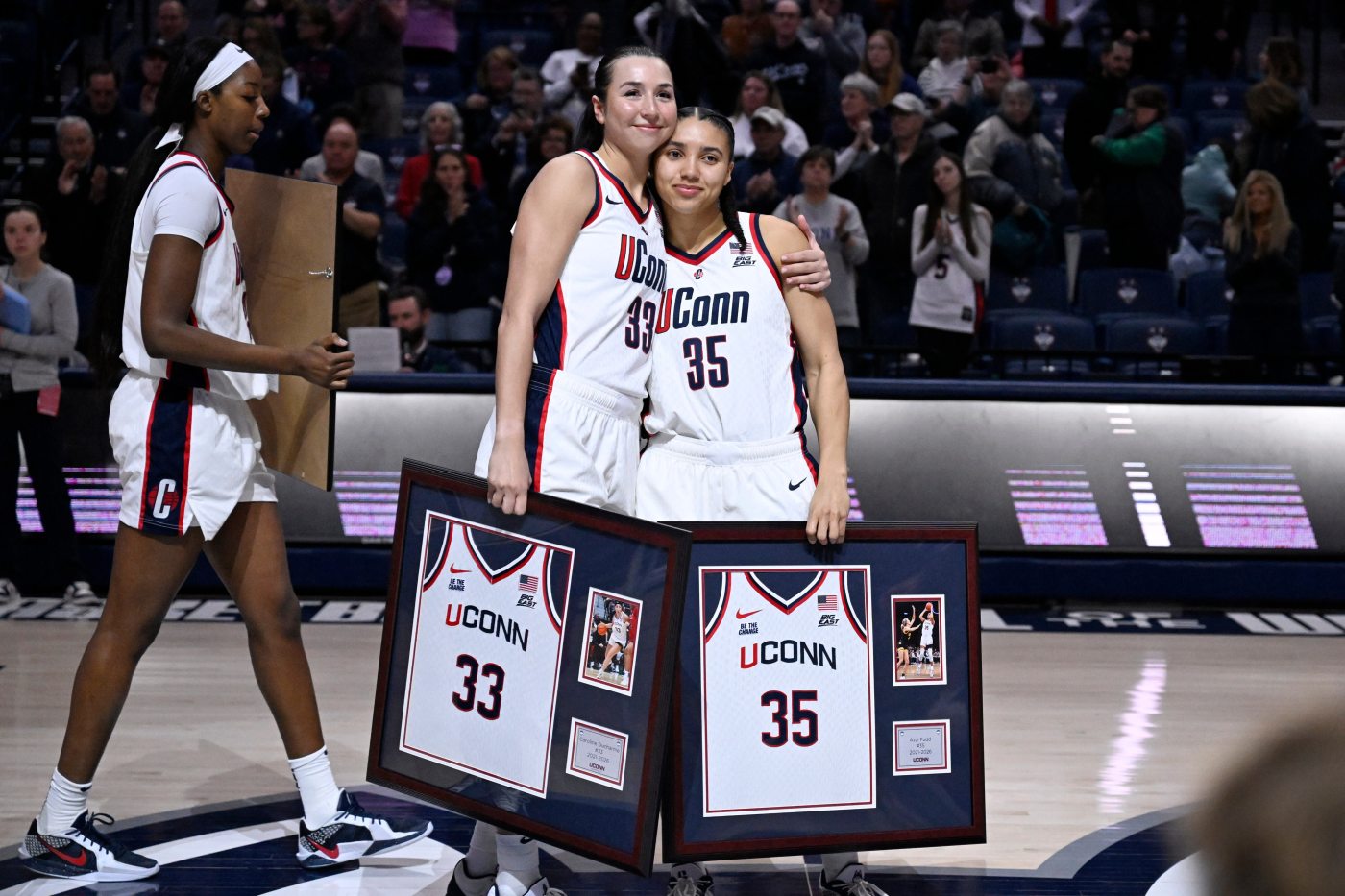 The star guard’s assessment was spot on: Her eyes were mostly dry by the time she walked across the court surrounded by her family, but she was swiping at tears with the collar of her jersey while watching from the tunnel as Ducharme was announced in front of the sold-out crowd at Gampel Pavilion.