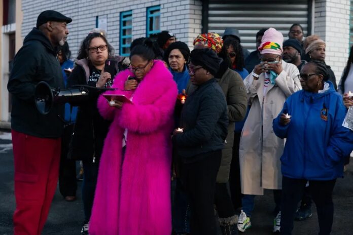 Family members of Everard Walker and community members pray during a vigil in Hartford’s North End on March 4, 2026. Credit: Shahrzad Rasekh / CT Mirror